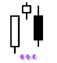 黄昏星刚好与启明星相反,它是顶部反转形态,预示着夜幕即将来临。黄昏星由三根K线组成,第一根是长阳线,第二根是小的阳线或小的阴线,第三根是长阴线。从形态上看,类似技术分析中的岛屿反转形态